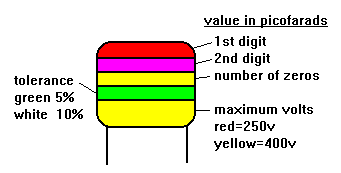 Like resistors, some capacitors are colour coded to indicate value, tolerance, working voltage etc. These colour bands are numbered from the top of the capacitor to the base. The colour coding is similar to Resistor colour coding.Capacitor Colour Code